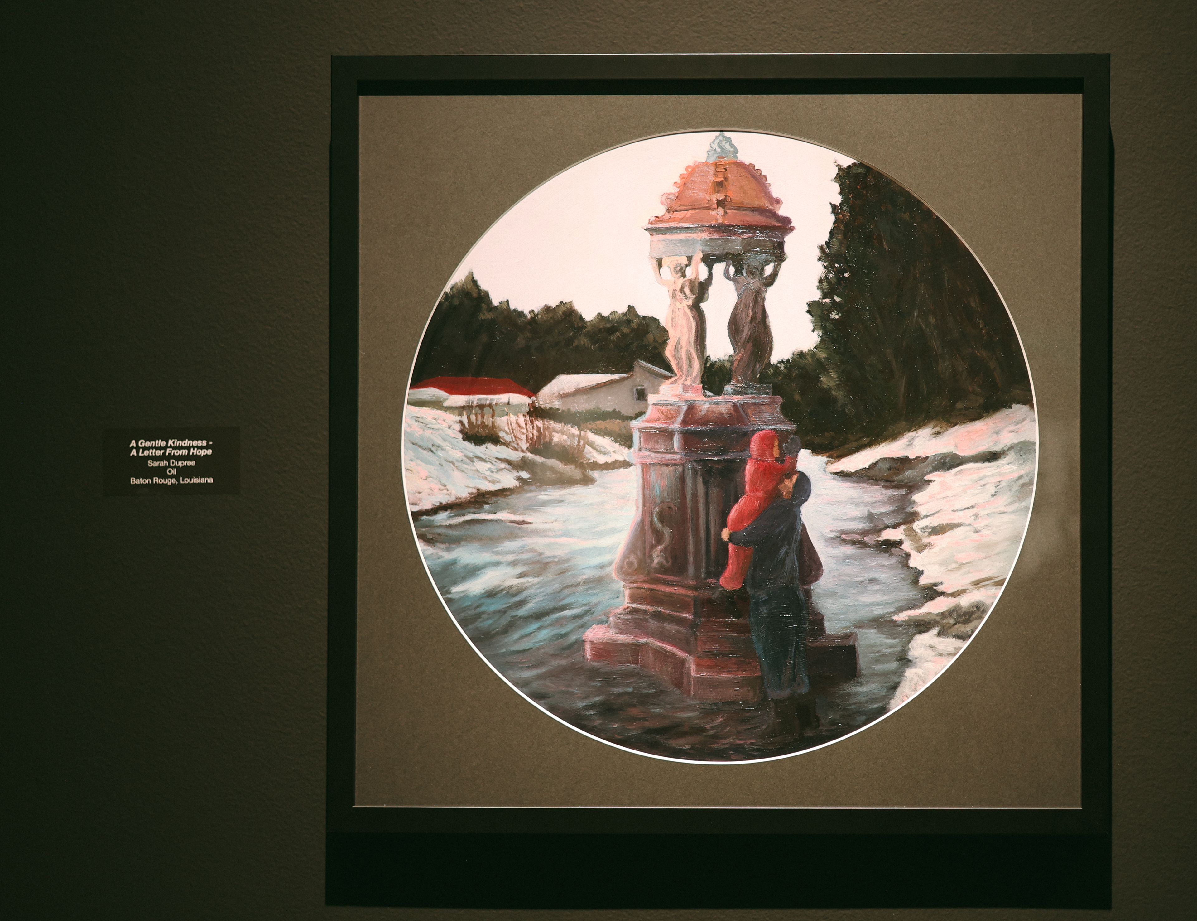When I was was first looking at this picture, preparing to place it in a painting composition, I felt the statue visually compared to the lamppost in The Chronicles of Narnia, which then led me to thinking about the Christmas themed artwork in the R.W. Norton Art Gallery, whose holiday show I was hoping to be featured in. I had worked as an intern there in my first few years of college, and knew the collection well. I always thought that the painting titled "The Christmas Letter" also compared to the Narnia Lamppost. The lamppost in the books and the movie was simply a marker of the new world they were entering. However, it always signified a coming of hope in my eyes; using all my visual mapping, I combined various elements from each picture described above and composed "A Gentle Kindness - A Letter From Hope."