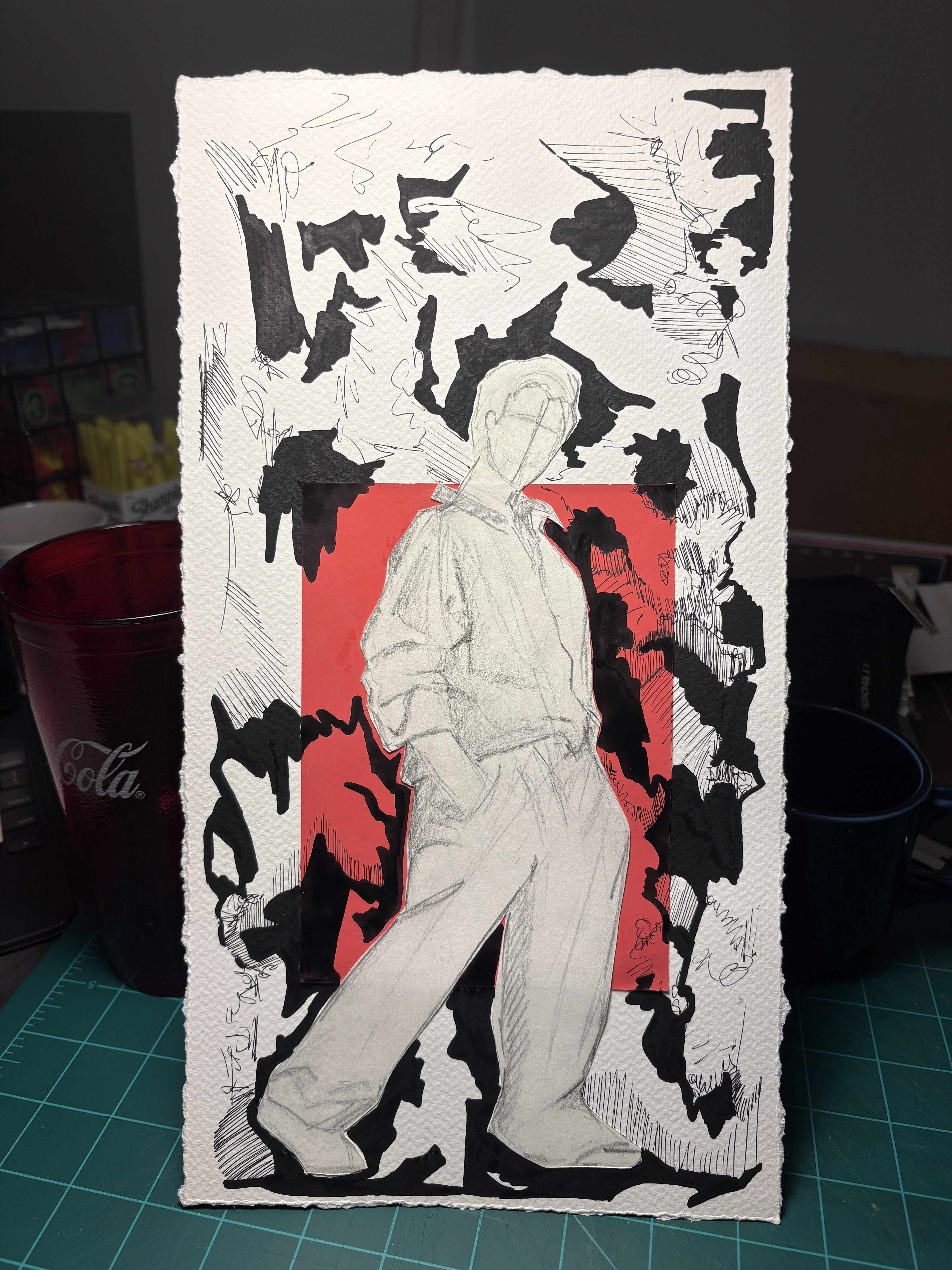 001 - I am shifting the majority of my work to incorporate more of the human figure and using my abstractions as background, where they act as landscape. I have brought in more of my design experience as well as photography to achieve the new look I'm working towards.